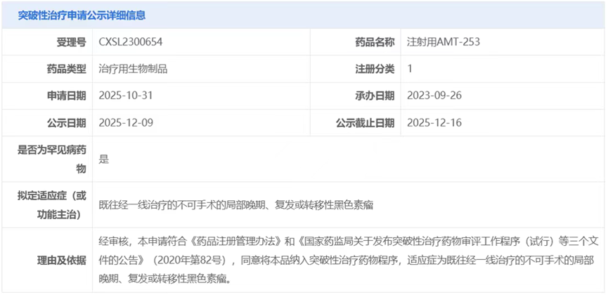 Currently, treatment options for advanced melanoma are limited, primarily relying on targeted therapy, immunotherapy, and chemotherapy, but overall efficacy is limited, leaving significant unmet clinical needs. Given the reported objective response rates of approximately 8.8% to 42.9% and median progression-free survival of approximately 2.8 to 6.6 months for existing second-line melanoma therapies, these results support the potential of AMT-253 to become a best-in-class treatment for this indication, and the CDE has granted it Breakthrough Therapy designation.